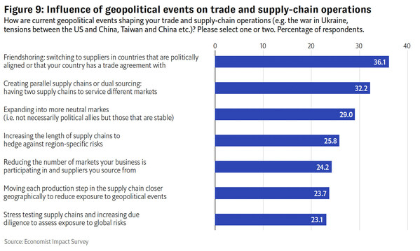 在全球化的新时代里,随着企业试图降低整个供应链的风险,地缘政治风险加剧的局面正在改变着全球贸易的格局。有超过三分之一的公司采用了友岸外包来改变贸易和供应链运营,有 32% 的企业建立了平行供应链或双渠道。