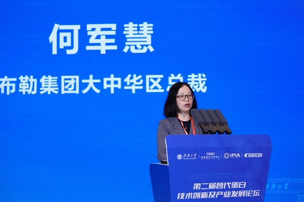 布勒集团大中华区总裁何军慧女士致辞。她表示,替代蛋白是未来食品的重要发展方向之一。布勒集团的愿景就是通过联合组织成员的力量,打通全产业链,实现上中下游紧密合作,共同推动未来食品领域新技术的前沿性变革,帮助更多的企业开发创新蛋白产品,以可持续的方式满足全球不断增长的蛋白需求。