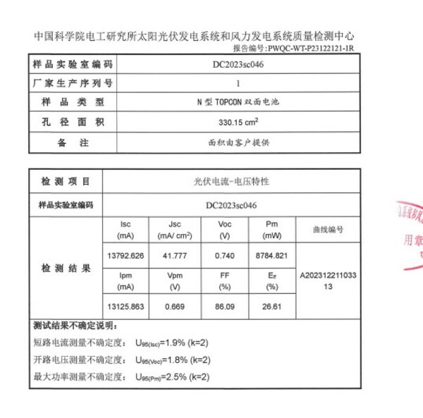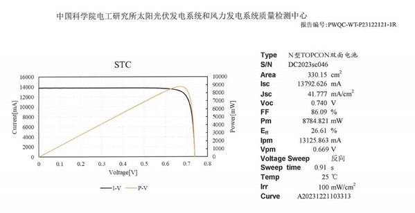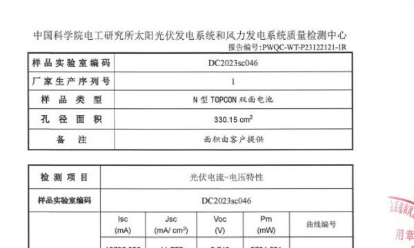 天长2024年1月17日 /新闻稿网 - Xinwengao.com/ — 新年伊始,龙马精神,英发睿能又传喜讯。2024年1月16日,英发睿能再次收到中国合格评定国家认可委员会(CNAS)针对N型TOPCon双面电池的检测报告。此次报告结果显示,英发睿能N型TOPCon双面电池测试效率达到了26.61%,再次刷新历史记录,跻身行业效率第一阶梯。