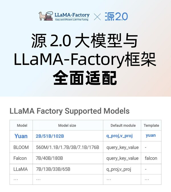 北京2024年1月18日 /新闻稿网 - Xinwengao.com/ — 近日,源2.0开源大模型与LLaMA-Factory框架完成全面适配,用户通过LLaMA-Factory,即可快捷、高效地对不同参数规模的源2.0基础模型进行全量微调及高效微调,轻松实现专属大模型。