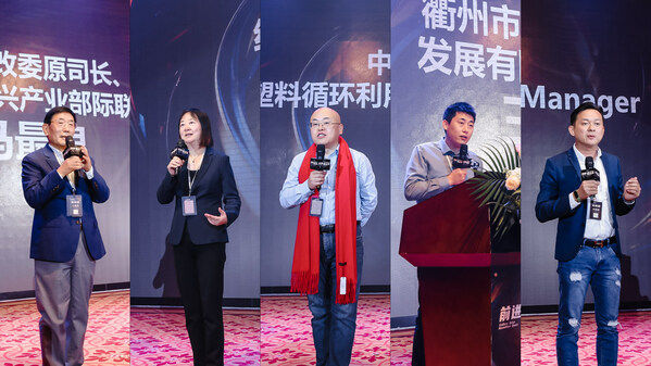 致辞嘉宾从左到右依次为:国家发改委原司长、国家战略性新兴产业部际联络顾问马最良;红杉资本中国基金合伙人富欣;中国合成树脂协会塑料循环利用分会创始人/常务副会长王旺;衢州市通恒再生科技发展有限公司总经理王瑞丰;马来西亚 GlobalCycle General Manager 林敬儒