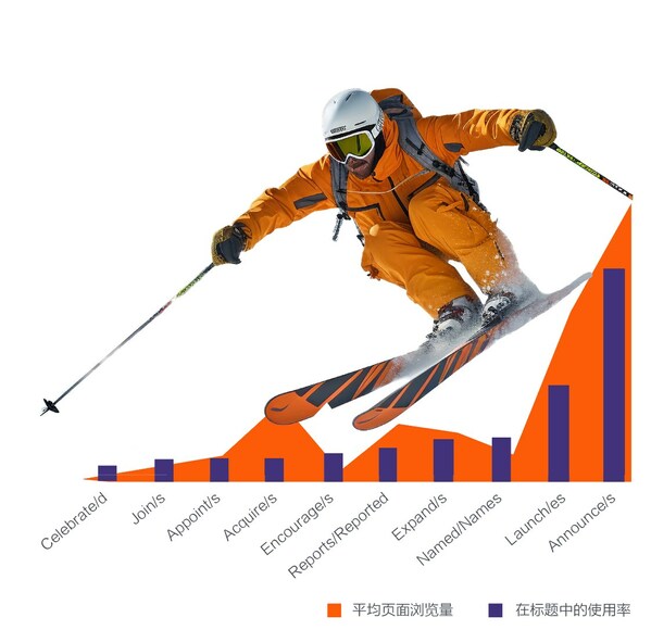 以报告的数据调查来看,英文新闻稿中的"Announces"(宣布)、"launches"(推出) 和"names"(任命) 始终是公关人士的首选。"names"和"expands"(拓展) 的使用比例和页面浏览量更高。