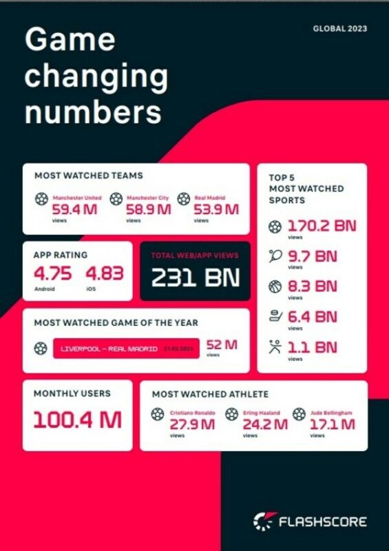 著名球星 Cristiano Ronaldo 的个人资料浏览量高达 2790 万次 布拉格2024年1月31日 /新闻稿网 - Xinwengao.com/ — Flashscore 网站和应用程序的每月平均用户数量超过一亿,其 2023 年 12 个月的浏览量更是逾 2300 亿次,相较于去年,其应用程序浏览量增加 24%,网站浏览量增加 16%。这一全球内容提供平台为体育迷带来各种精彩纷呈的内容,包括实时比分和最新体育动态。 Flashscore breaks records around the world in 2023 Flashscore 在其提供内容的 42 个市场中,足球是最受欢迎的运动项目,该内容的观看次数超过 1700 亿次。利物浦对阵皇家马德里的欧冠比赛成为本赛季最受观众瞩目的一场。在 16 强赛首回合中,皇马最终以 5-2 的比分获胜。 从球星的角度来看,葡萄牙前锋Cristiano Ronaldo是平台中搜索次数最多的运动员,全年点击率超过 2700 万次,足以证明其受欢迎的程度。 就球队而言,曼联夺得 2023 年最受欢迎俱乐部的桂冠,那里也是 Ronaldo 曾经效力的队伍。其同城对手曼彻斯特城紧随其后。目前,曼彻斯特仍以 0.9% 的优势领先。 所有用户的平均评分为 4.79,表明改进和新功能的持续推出正为用户提供使其能够及时了解各种体育赛事最新动态的最佳平台。 之所以能够在 2023 年实现如此优异表现,Flashscore 首席执行官 Pavel Krbec 解释道: "因为我们认真听取来自所有市场的意见,并将在 2024 年和未来继续改进。今年对体育而言是非常重要的一年,不仅有多项国际足球赛事,还有奥运会。我们将作为全球体育的核心角色,为用户提供顶级体育报道,为合作伙伴提供创意性的展示机会。"