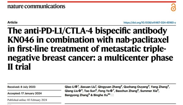 苏州2024年2月6日 /新闻稿网 - Xinwengao.com/ — 康宁杰瑞生物制药(股票代码:9966.HK)宣布,PD-L1/CTLA-4双抗KN046联合白蛋白结合型紫杉醇一线治疗晚期三阴乳腺癌的Ⅱ期临床研究结果,近日在国际知名期刊Nature Communications(最新SCI影响因子16.6,JCR 1区)在线发表。中国医学科学院肿瘤医院徐兵河院士为该文通讯作者。
