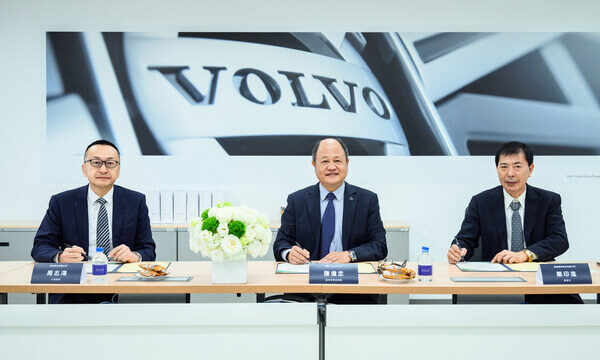 Mr. John Chou, CEO from Zuellig Pharma Taiwan (left); Mr. Yin-Chin Cheng, President of Long Feng Medical Logistics (right), and Mr. Willy Chen, Director of Commercial Vehicle at Taikoo Motors (middle), at the contract signing for Volvo electric truck for cold chain logistics.