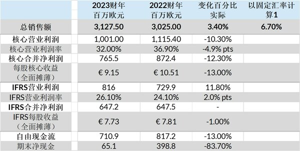以CER计算[1],核定2023财年的[1]总销售额增长率为6.7%(报告为3.4%),该增长主要归因于以下两方面:增长平台的强劲销售额[2]和新药的巨大贡献。核心营业利润率为32.0%(IFRS营业利润率为26.1%),这主要得益于近期的收购活动带来的产品管线进一步扩充和研发投资的加速 以CER计算[1],2024年的财务指引[3]包括总销售额增长[4]大于6.0%,核心营业利润率[5]约为总销售额的30%,其中包括四款可能会推出的产品和一条正在不断完善的产品管线的潜在影响 2023年12月资本市场日概述了新的增长阶段和中期财务前景 巴黎2024年2月23日 /新闻稿网 - Xinwengao.com/ — 益普生公布其2023年全年及2023年最后一个季度的财务业绩。 2023财年和2022财年合并业绩摘录[6]: 益普生首席执行官David Loew表示:"这一年的良好业绩为益普生在2024年的发展奠定了良好基础,2024年将是激动人心的一年,我们预计将上市四款新产品及适应症,并有机会进一步扩大研发管线。随着益普生的转型,我们的执行力在不断提高,这为销售额的持续增长提供了坚实保障,与此同时,我们不断前进的研发管线也为患者持续带来更加鼓舞人心的消息。 在强大的资产负债表的支持下,我们的外部创新战略正在扩大三个治疗领域的潜在药物数量。继2023年收购Albireo并成功推出Bylvay之后,我们期待在今年创造更多里程碑,并将通过额外的外部创新交易不断丰富研发管线。我有信心,这一战略将为患者带来更多的药品,并确保益普生的可持续增长。" 2023年成果 2023年,益普生继续成功推进公司战略"聚焦、共赢、服务患者与社会"。增长平台实现了两位数增长,其中Cabometyx和Dysport的销售额增长分别高达22.9%[7]和14.5%[7]。新药Bylvay®(odevixibat)、Sohonos®(palovarotene)和Tazverik®(tazemetostat)也为销售额的增长做出了贡献,而Somatuline®(兰瑞肽)的销售额则继续逐步下滑(-10.4%[7]),仅占总销售额的34%(2022财年:40%)。 核心营业利润率下降至32.0%(2022财年:36.9%),反映出收购Albireo和Epizyme带来的投资增加,包括为新产品管线提供资金所导致的研发费用增加。益普生年末净现金为6510万欧元,这主要得益于7.109亿欧元的稳定自由现金流。 2023年3月,益普生收购了一家治疗儿童和成人胆汁淤积性肝病的胆汁酸调节剂的领先创新者Albireo,从而进一步扩充其罕见病产品组合和研发管线。交易的主要焦点是Bylvay,这是一种强效、每日一次口服的非全身性回肠胆汁酸转运抑制剂。 2023年的研发管线进展包括Elafibranor治疗原发性胆汁性胆管炎(PBC)和Cabometyx治疗前列腺癌的Ⅲ期试验分别获得积极结果。Onivyde(用于一线胰腺导管腺癌[1L PDAC]治疗)和Elafibranor的监管提交得到受理。这一年,美国食品和药物管理局(FDA)还批准了Sohonos和Bylvay的上市许可申请,分别用于治疗进行性骨化性纤维发育不良(FOP)和Alagille综合征。 2024年优先事项和财务指引 益普生预计将在2024年上市四款新产品及适应症,此前,Onivyde在美国(H1)用于治疗1L PDAC、Elafibranor在美国(H1)和欧盟(H2)用于治疗二线PBC以及Odevixibat在欧盟(H2)用于治疗Alagille综合征的上市申请均已获得监管部门批准。Sohonos近期在美国上市,用于治疗FOP。 公司将利用现有平台,继续推动全球增效计划,为新产品的推出和管线提供大量的进一步投资。 益普生为2024财年制定了以下财务指引,其中排除了未来外部创新交易的任何潜在影响: 以固定汇率计算,总销售额增长超过6.0%。基于2024年1月的平均汇率水平,预计汇率将对总销售额产生约1%的不利影响 核心营业利润率约为总销售额的30%,其中包括预期的早期和中期外部创新机会带来的额外研发费用 总销售额指引包括对在美国和欧盟进一步推出Somatuline兰瑞肽仿制药的预期。 资本市场日与中期财务展望 益普生在2023年12月举行的资本市场日上概述了下一阶段的增长情况。除了目前和近期可能推出的几款新产品外,在中期还将推出许多具有里程碑意义的新药,以加强公司的多元化业务,包括七款预期药物和现有药物的组合,每款药物的预期峰值销售额至少为5亿欧元。此外,还将采取积极的外部创新战略,旨在为推动研发管线的可持续增长提供平台。 公司概述了以下中期财务展望[8]: 按固定汇率计算,2023-2027年期间,总销售额平均每年增长至少7% 2027年核心营业利润率至少为总销售额的32% 环境、社会和治理:Generation Ipsen 在上述资本市场日上,益普生提出了一个雄心勃勃的可持续发展路线图,该战略以Generation Ipsen为基础,重点关注四大支柱:环境、患者、员工和治理。于2023年取得良好进展。 益普生致力于在整个价值链中科学减少温室气体排放。与2019年基线相比,公司在2023年实现了范围1和范围2排放减少36%。与同一基线年相比,2023年范围3降幅达29%。益普生有信心在2025年底实现碳中和,到2045年实现净零排放。 公司以患者为中心,将临床试验结果与非FDA/EMA[9]监管申请之间的时间缩短了25%。2023年,53%的GLT由女性组成,而2022年为48%;2023年,43%的同事从事医疗保健或环境项目。 ISO37001反贿赂管理体系认证获得续期。 欲获得完整信息,请点击【阅读原文】,查看益普生于2024年2月8日发布的报告。 说明: 所有财务数据均以百万欧元为单位。除非另有说明,本报告的业绩涵盖2023年12月31日之前的12个月期间(2023财年)和2023年12月31日之前的3个月期间(2023年第四季度),而进行数据对比的对象为2022年12月31日之前的12个月期间(2022财年)和2022