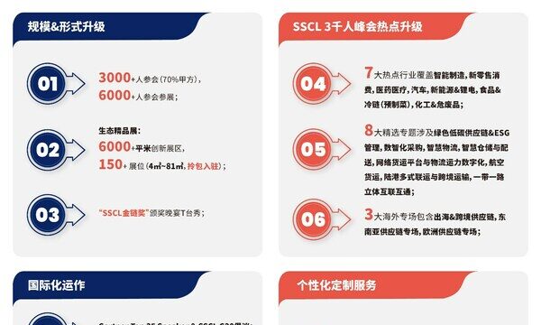 作为亚太区最大规模、最具影响力的供应链物流创新博览会,SSCL APAC 2024分为主论坛 + 18个精选专题分论坛+ 15场同期workshop,将邀请300+名专家大咖围绕物流供应链就时下热点话题开展深度对话与分享,将邀请150+ 赞助商及展商展示了众多供应链物流领域的创新技术及产品,同时将有3000+ 来自物流供应链领域的嘉宾莅临大会,6000+专业观众参会参展。此外,SSCL APAC 2024将设置“SSCL金链奖”颁奖晚宴、“SSCL G20倡议”和“SSCL海外展团巡展&会后考察”等环节,多样化的方式引领商务合作新机遇,为行业创新和发展树立新的标杆。