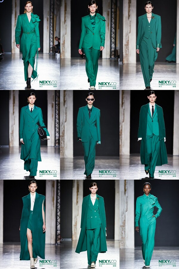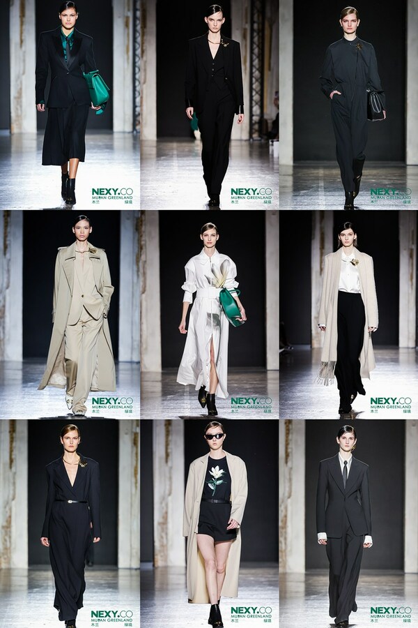 大秀以"木兰绿境"为主题,将品牌色奈蔻绿作为秀场主色调,将木兰花运用在图案和工艺之上——立体裁剪的匠心工艺将木兰赫然伫立在服装领部,彰显蓬勃的生命力量;数码定位印花将木兰花稿更生动还原,栩栩如生;精雕细琢的金属木兰饰品与服装一起呈现都市木兰刚柔并济的时代姿态。以经典西装π suit为智美名片,经典大衣94050包罗时尚万象,为NEXY.CO(奈蔻)品牌"知性、简约、智美"的标志性风格增添了更为丰富的诠释,用时装致敬都市精英女性的智美之姿。
