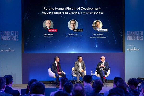 西班牙巴塞罗那2024年2月29日 /新闻稿网 - Xinwengao.com/ — 在 2024 世界移动通信大会(MWC)上,荣耀终端有限公司CEO赵明与一众行业领袖进行了一场以"在AI创新中以人为中心:为智能设备部署AI的关键考虑因素" 为主题的圆桌论坛。该论坛由 GSMA首席执行官兼董事 John Hoffman主持,并邀请了高通公司全球高级副总裁 Alex Katouzian分享见解。他们一致认同,AI终端在确保用户隐私的同时,需要提供更直观的、以人为中心体验。