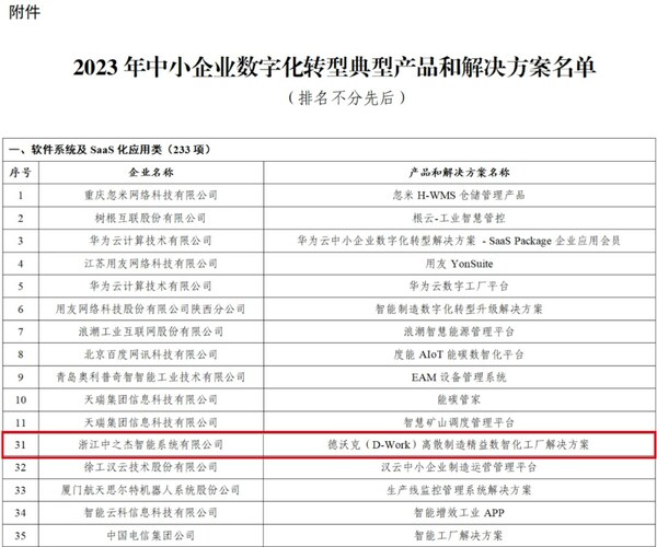 宁波2024年3月1日 /新闻稿网 - Xinwengao.com/ — 为促进中小企业数字化转型供需对接,工业和信息化部中小企业局组织开展了2023年中小企业数字化转型典型产品和解决方案征集。中之杰智能的德沃克智造凭借在工业软件领域创新的技术实力和在离散制造行业卓越的实践能力,入选2023年中小企业数字化转型典型产品和解决方案名单。