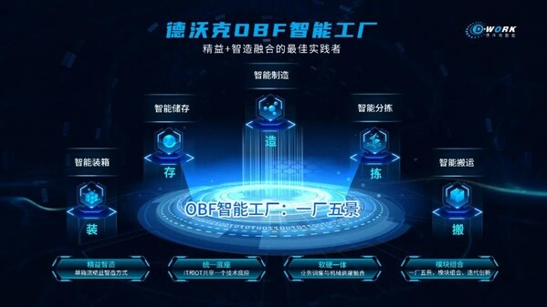 德沃克智造以独特的单箱流精益智造模式和统一的ICS控制底座,将业务调度与机械调度融合一体,打造了一厂五景:智能装箱、智能存储、智能分拣、智能搬运、智能制造。在德沃克智造赋能的智能工厂中,IT和OT共享一个技术底座,智能驱动软硬交融,机动物动、物动单动,机-物-单三合一,实现业务与执行一体化、自动与手动一体化、整体与局部模组化。德沃克智造深度融合精益+智造的最佳业务实践,强化了"硬本领",提升了"软实力",实现从原材料卸货到成品出库的全局柔性智能化生产,真正让离散制造不再离散。