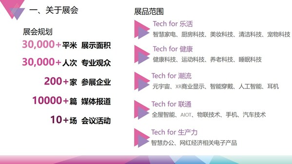 接着,TechG项目经理王寰女士向与会人员详细介绍了展会规划。2024上海国际消费电子技术展将于10月10-12日在上海新国际博览中心举办,计划展出面积达30,000平方米,将邀约超200家科技企业参展,30,000名专业观众到场采购并举办10余场同期会议活动。展会将以"智慧未来新入口"为主题,聚焦"AI重塑,消费升级,科技向善,链接全球"。围绕"乐活","健康","潮流","联通","生产力"5大方向,集中展示人工智能、虚拟现实、全屋智能、机器人、户外科技等最新消费电子产品,加强"创新型消费电子智能终端"新动能,帮助中国及全球消费电子企业搭建国际化品牌汇聚、产业协同、创新引领、市场升级的商贸及宣传平台,迎接消费电子行业"新周期"、打造"新场景"、共创"新格局"。