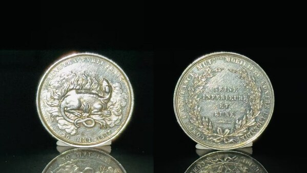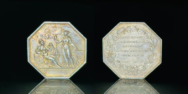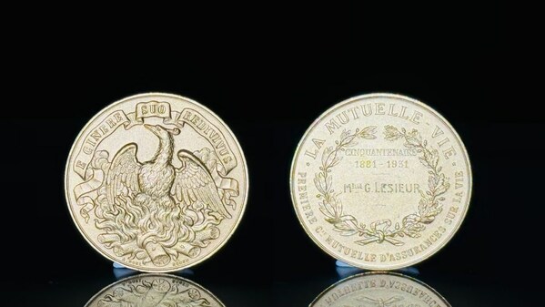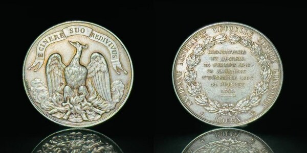 1875年,公司再次发行了一款麦朵尔,圆形带飘带的火凤凰纪念币。这款纪念币的正面除了展示火凤凰和拉丁文座右铭外,背面还精心雕刻了四个与公司历史紧密相连的重要时刻:1818年7月22日授权公司成立、1843年8月28日授权新开设的两家公司、1852年12月1日法兰西第二帝国成立、以及1856年7月11日授权由省级经营公司升级成全国经营。