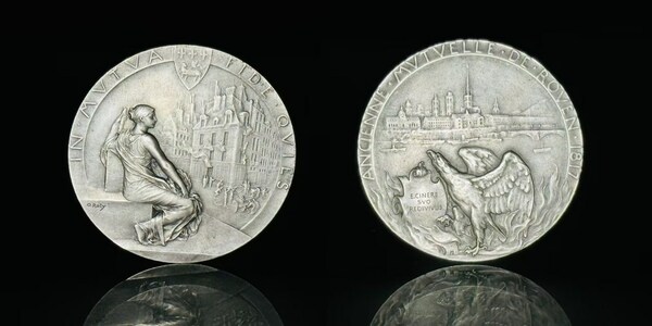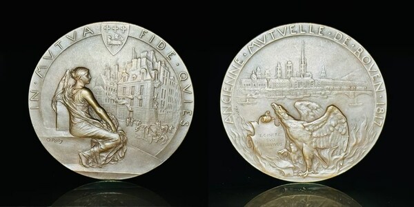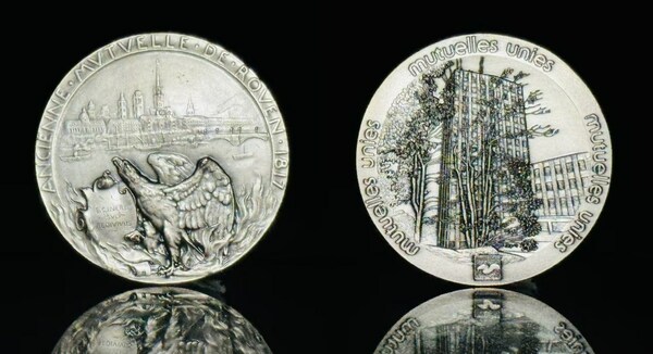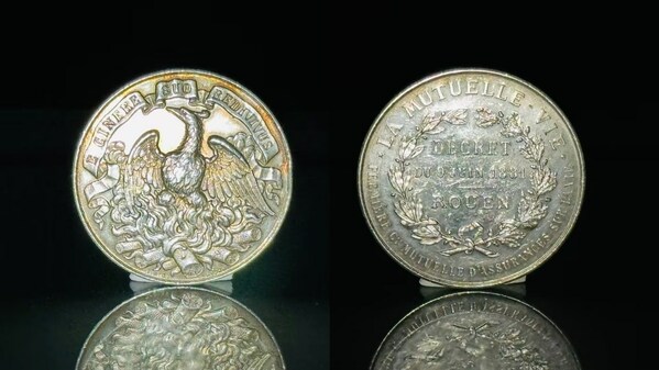 1881年,为纪念从1817年最初的公司到当时的Ancienne Mutuelle(前互助),公司特意发行了鲁昂安盛互助保险章。这款纪念章由著名艺术家Louis Roty(奥斯卡▪罗蒂)设计,正面图案中,互助女神手持卷轴和桂冠,遥望着正在扑救火灾的消防队员。上端刻有鲁昂市徽,边缘则是一行拉丁语铭文“IN MUTUA FIDE QUIES”,意为“基于互信的存放”。背面则展现了塞纳河畔鲁昂城市的远景,近处是一只在火焰中展翅翱翔的老鹰。旁边铭牌上的拉丁文“E CINERE SUO REDIVIVUS”寓意着“浴火重生”的精神。边缘的法文铭文“ANCIENNE MUTUELLE DE ROUEN 1817”(1817年鲁昂安盛互助保险)则清晰地标注了公司的历史起点。