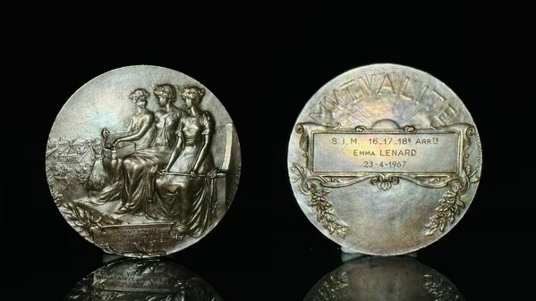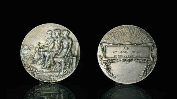 1910年,公司成立了第一支职工养老基金,为纪念这一重要时刻,公司发行了Ancienne Mutuelle(前互助)服务纪念章。该纪念章正面展示了端坐的三位女神,分别代表着工农商。远景处是城市的轮廓,与女神们的形象相互呼应。