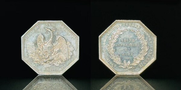 到了1845年,公司又推出了三款新的火凤凰代币,分别是重约15克的小八角火凤凰代币和重约23克的大八角火凤凰代币。这些代币采用银质和银质镀金材质,边缘设计独特,旨在纪念1818年7月22日授权公司成立,以及1843年8月28日授权新开设的两家公司。