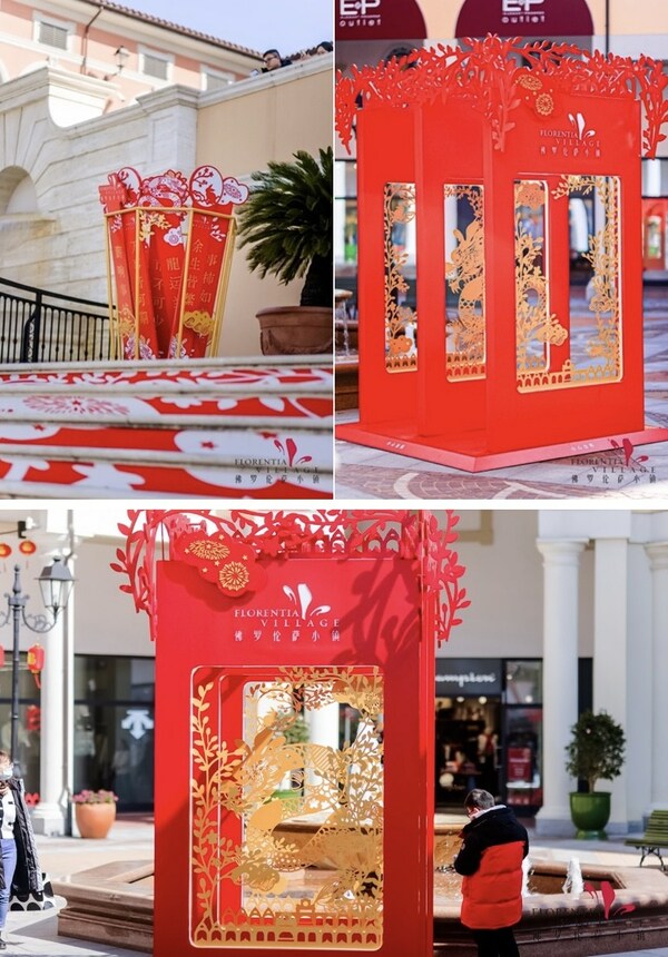 以龙年IP为主题的剪纸艺术装置也在京津、上海、广佛、武汉、成都和重庆小镇齐齐亮相,透过浪漫视角以纸为媒,在立体镂空的佛罗伦萨小镇基础上,层层叠加四季元素,延伸空间感,勾勒出龙的灵动身姿。所有元素组合成完整的剪纸画面,所有的点线面都连缀于一体,生动描绘着木龙从茂密的森林里腾飞向云霄,意象万物从意大利风情的建筑群中蔓延生长。除装置外,各个小镇的店铺橱窗也饰以龙年IP为主题设计的窗花剪纸,为小镇点缀一抹明艳的新春色彩,增添浓浓"年味"。