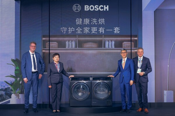 博世家电8系净臻系列活氧洗烘套装新品首发(从左到右依次为:博西家用电器(中国)有限公司洗涤产品事业部高级副总裁Erik Kruijer先生、中国家用电器协会秘书长王雷、博西家用电器集团大中华区总裁宋凛冰先生、博西家用电器集团大中华区高级副总裁兼首席运营官金世峰先生)