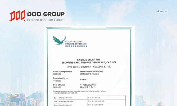 香港2024年3月15日 /新闻稿网 - Xinwengao.com/ — Doo Group子公司Doo Financial HK Limited(中央编号:BSM562)成功获发香港证券及期货事务监察委员会(HK SFC,以下简称"香港证监会")颁发的第1类(证券交易)牌照。