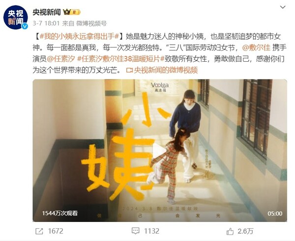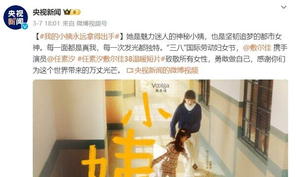 哈尔滨2024年3月19日 /新闻稿网 - Xinwengao.com/ — 今年38妇女节,一条由敷尔佳出品,任素汐主演的态度短片——《小姨》,在全网爆火。#任素汐敷尔佳38温暖短片##我的小姨永远拿得出手# 等话题相继登上热搜,微博累计热度破2亿,迅速撬动品牌声量,成功实现现象级营销出圈。