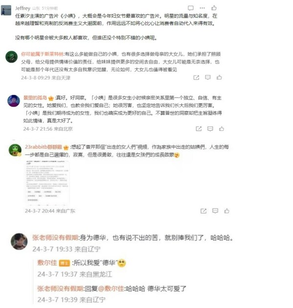 短片一经发布,央视新闻、中国妇女报等官方媒体迅速跟进,扩大声量。评论区涌现无数网友分享自己的小姨以及自己作为小姨的人生故事,更有网友将"小姨"与之前火爆的"德华"梗、"出走的女人们"内容联动,衍生的优质UGC形成了裂变式传播。