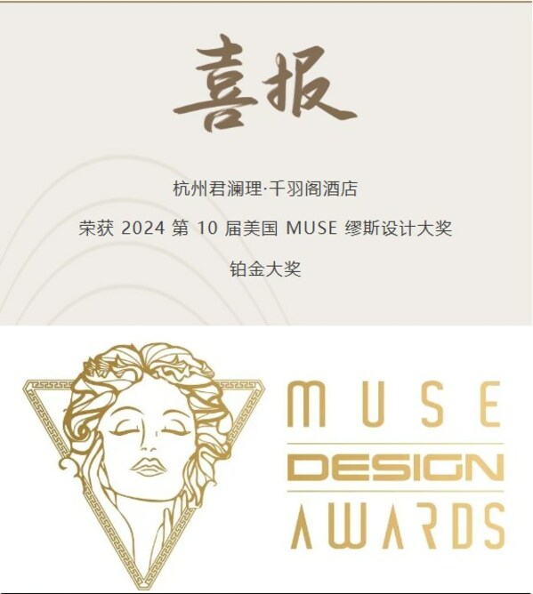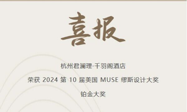 杭州2024年3月21日 /新闻稿网 - Xinwengao.com/ — 喜报:杭州君澜理•千羽阁酒店荣获 2024 第 10 届美国 MUSE 缪斯设计大奖铂金大奖。