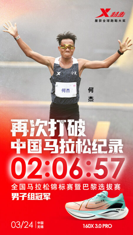 无锡2024年3月25日 /新闻稿网 - Xinwengao.com/ — 3月24日,何杰在无锡马拉松以2小时06分57秒再次刷新中国男子马拉松纪录,与其脚下的特步冠军版跑鞋再度携手突破历史,并肩进入中国马拉松"206时代"。自2023年无锡马拉松、2023年日本福冈马拉松之后,特步冠军版跑鞋助力中国马拉松运动员接连三刷国家纪录。