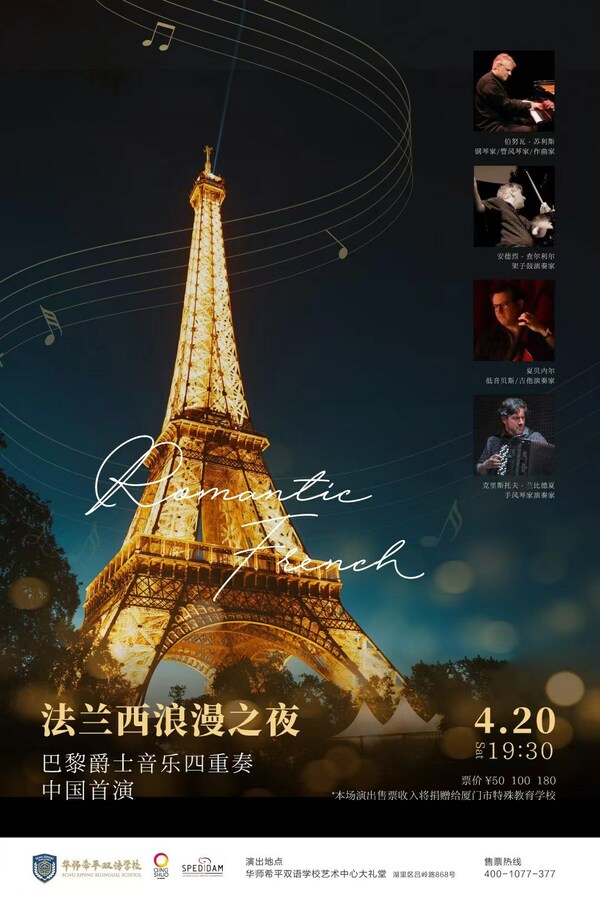 4月20日,这支极具法兰西风情的爵士四重奏乐团(钢琴/架子鼓/低音贝斯/手风琴/爵士吉他)即将来到厦门,在华师希平双语学校开启中国首演!