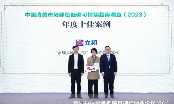 上海2024年3月26日 /新闻稿网 - Xinwengao.com/ — 3月26日,由每日经济新闻、上海市消费者权益保护基金会联合主办的首届每经绿色低碳可持续消费论坛在上海举行。立邦凭借可持续产品的绿色消费实践案例,在论坛上获得"中国消费市场绿色低碳可持续趋势调查(2023)年度十佳案例"荣誉。立邦中国行政&服务总部副总裁、可持续发展办公室负责人汤若玲出席领奖。