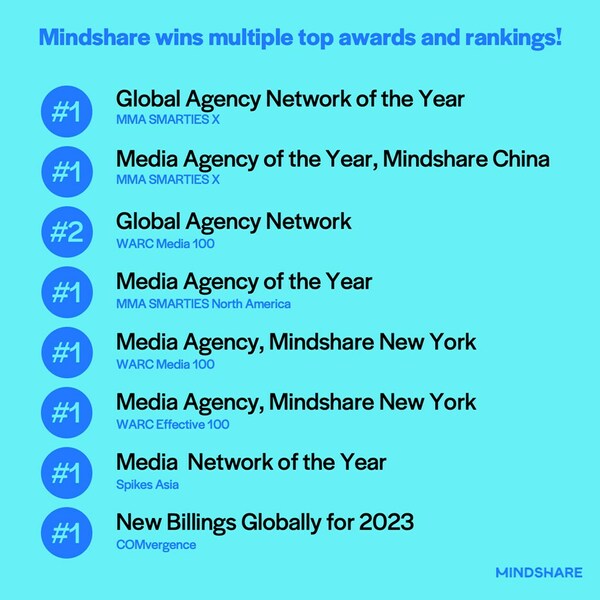 Mindshare 在 WARC Media 100和 Effective 100 排行榜中名列前茅,获得年度网络和代理商荣誉称号 COMvergence 最新报告显示,Mindshare 在新账单中位列全球 #1 纽约、伦敦、新加坡和上海2024年3月28日 /新闻稿网 - Xinwengao.com/ — 隶属于 GroupM 和 WPP 的媒体服务公司 Mindshare 于 2024 年第一季度取得了骄人成绩,在多个权威行业排名和颁奖典礼上获得了多个令人印象深刻的奖项。该机构获得的荣誉包括 MMA SMARTIES X 全球年度代理网络、MMA SMARTIES North America 年度媒体代理商和 Spikes Asia 年度媒体网络,并在 WARC Media 100 和 Effective 100 排名中均位列 #1。此外,在 COMvergence 2023 年新账单中,Mindshare 在全球排名中位列 #1。 Mindshar 全球奖项列表 Mindshare 全球首席执行官 Adam Gerhart 表示:"能获得广泛的认可也是我们与客户建立的信任及合作伙伴关系的有力证明。当客户倡导真正的合作关系,持续向前迈进,并与我们共同做出勇敢的决定时,我们的努力就必然会促进客户增长,并为其业务带来积极影响。" MMA SMARTIES X 年度全球代理网络 在 MMA SMARTIES X Awards 中,Mindshare 被评为年度全球代理网络,Mindshare China 被评为年度媒体代理商,该奖项旨在表彰通过创新实现重大业务影响的全球营销活动。该代理网络在北美和亚太地区获得了 32 个奖项,其中包括 Mindshare China 的 Louis Vuitton Aranya Show 活动获得的 13 个金奖、9 个银奖、9 个铜奖和最佳展示奖。此外,WPP 还获得了年度控股代理公司奖。 MMA SMARTIES North America 年度媒体机构 Mindshare 荣获 MMA Smarties North America 奖项,这是旨在表彰现代营销活动中的卓越表现和创造力的顶级奖项。Mindshare 被评为北美年度媒体代理商,并凭借推动商业、社会影响力、全渠道营销等领域的创新活动获得了 9 个金奖、3 个银奖和 7 个铜奖。该代理商凭借与打击反犹太主义基金会 (FCAS) 和 WPP 姊妹机构 VML 合作的 #StandUpToJewishHate 活动,获得了最佳展示奖。 该代理商于 2024 WARC Media 100 和 2024 WARC Effective 100 排名中位列 #1 Mindshare 的纽约办事处在 2024 WARC Media 100 排名中位列 #1,巩固了该机构的卓越媒体领域全球领导者地位。此外,Mindshare 的媒体网络也稳居全球 #2,彰显了其全球完整网络具备的持续实力,公司在 Unilever、Tyson Foods、打击反犹太主义基金会、Castrol、瑞典旅游局、Honest Eggs Co 和 BlackRock 等不同市场开展的活动也屡获殊荣。被列入媒体机构百强的 Mindshare 办事处均位列榜单的前三分之一,包括伦敦办事处 (#14)、上海办事处 (#20)、墨尔本办事处 (#22) 和胡志明市办事处 (#32)。 Mindshare New York 在媒体机构实效性方面的排名也是 #1,并在 2024 WARC Effective 100 中被评为全球十大实效网络之一,该评选是一项独立的全球标准,旨在表彰在广告实效性方面的突出成绩。 Gerhart 表示:"创造力和实效性缺一不可。业界一直存在着这样一种错误观点,即创作具备实效性的媒体节目意味着剥夺节目的创造力和大胆创意,仅依赖久经考验的方法。WARC 的工作有助于纠正这个错误观点,并将实效性和创造力联系起来。在 WARC Media 100 和 WARC Effective 100 排行榜上位居前列的机构,其实效性和创造力的联系更为突出。我为我们的成就感到自豪,也感谢我们的客户对创新、冒险和持续增长的坚定承诺。" Spikes Asia 年度媒体网络 Mindshare 被 Spikes Asia 评为年度媒体网络,Spikes Asia 是亚太地区为表彰创造力和营销效果而颁发的最负盛名且最受欢迎的奖项。获得这一荣誉奖项凸显了 Mindshare 致力于为亚太地区的客户提供卓越媒体解决方案的承诺。Mindshare 在媒体类别中获得了四个奖项(1 项金奖,1 项铜奖,2 项提名)。此外,该机构在其他类别中获得了 5 项最高荣誉、4 项金奖、2 项银奖、1 个铜奖和 16 项提名。 创新和影响力带来良性增长 Mindshare 屡获殊荣的业绩证明了其坚定不移地致力于为客户实现良性增长。这种奉献精神在 COMvergence 的最新报告中有了进一步体现,在该报告的 2023 年全球新账单中,Mindshare 位列 #1,18.9 亿美元给人们留下了深刻的印象。该机构在多个品牌和屡获殊荣的活动中取得的成功,体现了其利用数据驱动的洞察力和创造性方法推动持久业务成果的能力。 关于 Mindshare Mindshare 是一家媒体服务公司,在转型时代加速客户的良性增长。我们创建的解决方案既有利于消费者,同时能够推动客户的增长。我们是 WPP 首个为特定目的而创建的公司,如今,我们在 86 个国家的 116 个办事处拥有 10,000 名员工,推动我们客户、员工、行业和世界的良性增长。www.mindshareworld.com