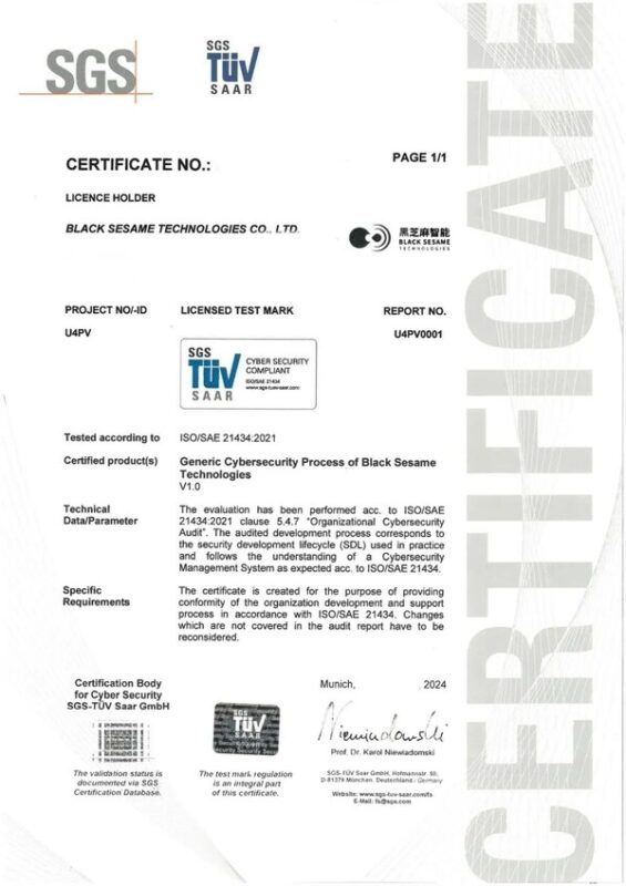 上海2024年4月7日 /新闻稿网 - Xinwengao.com/ — 2024年4月3日,国际公认的测试、检验和认证机构SGS通标标准技术服务有限公司(以下简称"SGS")为黑芝麻智能科技有限公司(以下简称"黑芝麻智能")颁发ISO/SAE 21434:2021汽车网络安全流程认证证书,标志着黑芝麻智能已建立起符合ISO/SAE 21434要求的网络安全产品开发流程体系,构筑了企业网络安全风险管控能力,在保障产品及企业的网络安全方面奠定了更为坚实的基础。 SGS为黑芝麻智能颁发ISO/SAE 21434流程认证证书 现场,黑芝麻智能SoC系统软件副总裁游昌海、SGS汽车服务事业部南区总监包岩及双方代表等出席了颁证仪式。 SGS为黑芝麻智能颁发ISO/SAE 21434流程认证证书现场 ISO/SAE 21434是全球公认的汽车行业网络安全标准,它全面规定了道路车辆及其部件和接口的网络安全要求,详细描述了如何根据网络安全问题实现网络安全管理目标。ISO/SAE 21434 被看作一项业界共识,是目前网络安全方面监管和认证机构的重要参考国际标准。 黑芝麻智能SoC系统软件副总裁游昌海表示:"近年来,国内智能网联汽车产业蓬勃发展,但随着汽车产品智能化、网联化水平的日益提高,网络安全已经成为汽车安全防护体系中至关重要的一环。本次顺利通过 ISO/SAE 21434 汽车网络安全流程认证,充分证明了 SGS 对黑芝麻智能安全体系持续改进、员工安全意识不断提高以及公司安全文化日益浓厚的认可。黑芝麻智能将一如既往地重视产品安全,严格遵守网络安全、功能安全等国际安全标准体系,为合作伙伴提供更安全、更可靠的产品。" SGS为黑芝麻智能颁发ISO/SAE 21434流程认证证书双方代表合影 SGS汽车服务事业部南区总监包岩在现场表示:"感谢黑芝麻智能对SGS的一贯支持和信任,继功能安全认证之后,黑芝麻智能此次网络安全流程认证的获得,再一次证明了黑芝麻智能始终坚守安全至上,为客户提供安全、可靠产品和服务的决心。我们很高兴能够见证黑芝麻智能在功能安全及网络安全领域的不断探索与研究。期待双方进一步加强合作,携手发挥技术与专业优势,推动智能汽车研发和应用的标准化建设,为用户带来更加安全、更高品质的智能电动汽车新体验。" SGS全球汽车安全技术中心能为整车厂和零部件供应商提供一站式解决方案,主要业务涵盖车辆、车规级芯片、半导体的功能安全,ASPICE,ISO 21448 SOTIF,ISO/SAE 21434信息安全等,并提供技术培训,技术咨询,技术服务,审核认证等服务。全球技术中心负责人Martin Schmidt是ISO 26262的发起者和起草人之一,目前SGS的汽车功能安全专家超过80人,已经为全球客户颁发ISO 26262功能安全及信息安全认证证书超800张。 未来, SGS将一如既往,助力更多企业伙伴的功能安全和汽车网络安全的发展,为汽车行业更安全、可靠、稳定的发展提供专业支持。