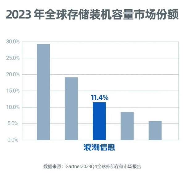 北京2024年4月7日 /新闻稿网 - Xinwengao.com/ — 近日,Gartner发布2023Q4全球外部存储市场报告。数据显示,2023年全球外部存储市场(ECB)销售额为21043.3M$,同比下降8.7%,装机容量达到55868PB,同比下降3.4%。浪潮信息存储产品装机容量达到6364PB,实现了逆势增长,占全球整体市场的11.4%,份额同比上升0.5%,连续三年(2021-2023)稳居全球前三。 2023年底,随着全球经济的逐步复苏,企业在存储领域的投资战略变得更加积极,全球和中国的外部存储市场的降幅显著收窄。同时,生成式人工智能(GenAI)负载的快速部署,促使企业正在增加面向AI场景的存储支出。浪潮信息凭借领先的技术与雄厚的产品实力,在企业级存储市场相对低迷的大环境下持续增长,并有望在新一代全闪与高端存储领域获得更大的市场优势。 经济复苏与GenAI技术革新驱动存储市场降幅收窄 存储容量需求大增 在整体经济形势好转的驱动下,数据要素价值不断凸显,依托存储动能,充分发挥海量数据和丰富应用场景优势,促进数字技术与实体经济深度融合成为必然趋势,这推动了企业在存储领域支出的信心回暖。在技术与应用层面,GenAI 等创新技术应用对于海量多元数据的全生命周期管理能力提出更高要求,催生了用户对于大容量存储的投资。Gartner 预计,新的 GenAI 工作负载主导的 ECB 生产交易将推动全球对外部存储容量的需求增长,2023-2028年最终用户支出的复合年均增长率将达到11.6%,成为未来企业级存储市场复苏的主要 突破口。 除了存储容量的增长之外,全闪与高端存储的崛起也是重要趋势:Gartner 预计,随着四位存储单元 (QLC) 存储在耐用性、成本等方面的改善,基于QLC的全闪将会占据更大的市场份额。同时,随着大模型训练等应用的扩展,用户对于存储性能、稳定性、可靠性都有着更高的要求,这将驱动高端存储市场的持续增长。 浪潮信息存储逆势增长 装机容量稳居全球前三 Gartner 数据显示,浪潮信息存储产品2023年的装机容量达到6364PB,实现了同比逆势增长,占全球整体市场的11.4%,份额同比上升0.5%。 浪潮信息在全球存储市场的逆势增长,其外部动因来自数字经济发展带来的中国存储市场向好发展趋势,给浪潮信息存储提供了广阔的市场空间。随着《"数据要素×"三年行动计划(2024—2026年)》等规划的落地,拓展数据要素的应用广度和深度,让数据要素价值得到充分释放已经上升为国家战略,而存储是有效地"存好"、"管好"、"用好"数据的关键前提。从内部动因来看,浪潮信息存储在持续进化的过程中,传承了敏捷进化基因,凭借深厚的技术积累和敏锐的市场洞察力,提出"新存储之道",秉承"存储即平台"的产品理念,致力于通过创新的技术和解决方案,解决数据存储和管理的痛点问题,为数据的高效存储、流通和应用提供有力支撑和保障。 而随着数据要素拓展的加速,以及GenAI、大模型等技术的深化,越来越多的企业用户渴求极致的存储性能,这驱动着全闪存储、高端存储渗透率的不断提升,也成为浪潮信息实现逆势增长的重要动能。近年来,浪潮信息继承了数十年来对于高端技术、高端品质的专注与坚持,加大了在GenAI、全闪、高端存储等领域的投入力度,取得了巨大成就。 在GenAI方面,浪潮信息依托全栈能力,提供面向GenAI的全栈存储解决方案,可通过分布式融合存储,构筑全局统一存储资源池、数据及元数据均统一管理,不同协议共享共用,实现数据全局共享,以及多协议的统一元数据管理,大大提升GenAI应用中数据处理效率。高端存储方面,浪潮信息在协议互通、超大容量、全闪架构、AI融合等诸多方面进行技术创新,实现了极致可靠性、极致性能等方面的突破:支持全局资源共享,且具跨框共享和硬盘柜框级冗余等能力,实现极致可靠;构建了端到端的RoCE能力,实现了极致性能,在国际权威机构SPC(存储性能委员会)的SPC-1性能基准测试中,浪潮信息高端全闪存储HF18000以2300万IOPS夺得集中式存储榜单第一。 近年来,浪潮信息与来自金融、制造、互联网、交通等各行各业的客户展开紧密合作,面向多模态融合交互的场景化需求,携手伙伴打造"平台+生态"的场景共同体,依托领先的存储产品与方案,构建卓越的存储基础设施,确保数据安全、稳定、高效存储,并支撑先进数字化、智能化应用,持续推动存储技术与产品的迭代升级,助力千行百业加速形成新质生产力。