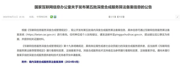 北京2024年4月15日 /新闻稿网 - Xinwengao.com/ — 4月11日,国家互联网信息办公室公开发布第五批深度合成服务算法备案信息,浪潮信息开发的"源"大模型算法已完成备案并获公布。