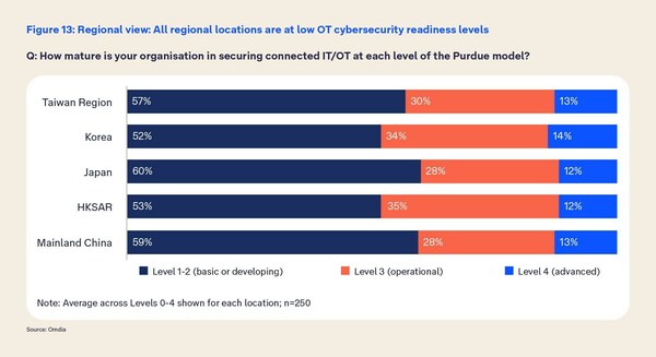 Telstra International委托技术研究公司Omdia对北亚地区OT和IT融合的成熟度、效益和机遇进行了评估。该研究对中国大陆、香港、日本、韩国和台湾地区250位企业和技术领导者进行了调查,调查结果发现,只有13%的企业在准备好应对IT/OT安全问题方面达到了高水平,大多数企业(60%)只达到了基本水平。