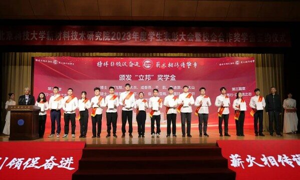 上海2024年4月19日 /新闻稿网 - Xinwengao.com/ — 4月16日,在北京科技大学72周年校庆之际,新材料技术研究院在北科大礼堂召开了2023年度学生表彰大会,现场揭晓了第三届"北京科技大学—立邦奖学金"获奖名单。"立邦奖学金"于2021年设立,用于评选北京科技大学新材料技术研究院品学兼优的在校学生学业奖学金,对象包括在校博士生和硕士生。目前已有45名北科大优秀学子获此殊荣,是双方校企产学研全方位合作的起点,旨在推动产学研的融合以培养行业所需的专业人才,加速行业的高质量发展。