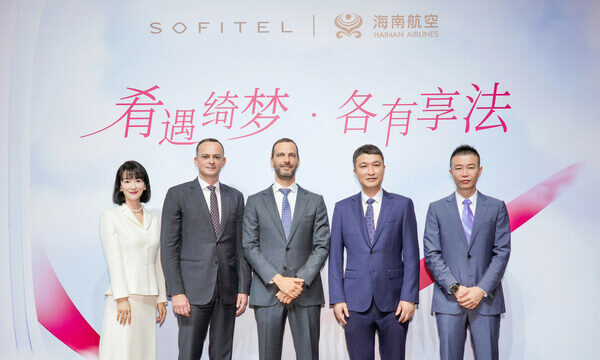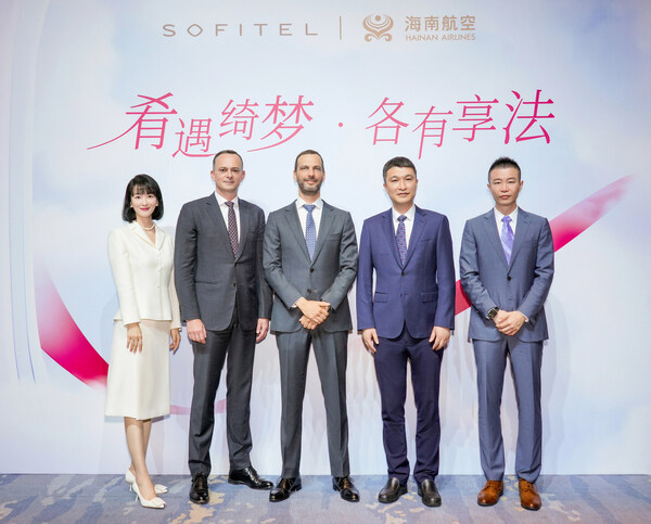 索菲特与海南航空升级合作发布会于海口索菲特大酒店举行(从左到右:雅高集团大中华区奢华及时尚生活品牌执行总监刘叶女士、雅高集团大中华区首席运营官乐睿思先生、法国驻广州总领事馆副总领事李杰明先生、海航航空集团有限公司副董事长兼总裁谢皓明先生、海南航空控股股份有限公司客舱管理部总经理杨鸥先生)