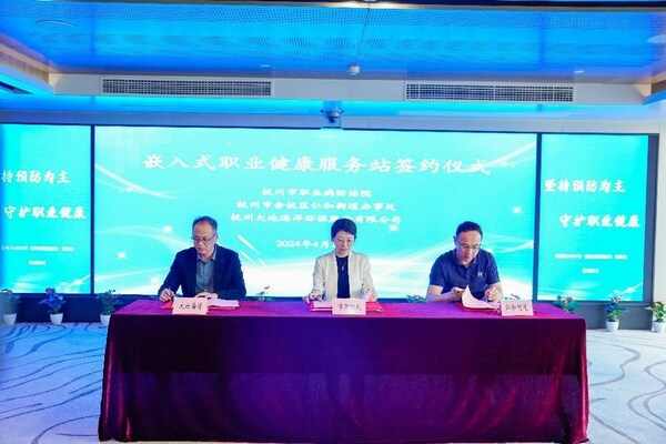 随后,杭州市职业病防治院、杭州市余杭区仁和街道办事处、杭州大地海洋环保股份有限公司的相关代表上台,进行了嵌入式职业健康服务站签约仪式,这是杭州市职业病防治院推出的集"标准化"卫生工程预防、"个性化"健康体检、"专业化"病例诊断治疗、"系统化"风险评估预警、"菜单化"健康科普讲座、"一体化"健康咨询指导为一体的助企惠企服务。