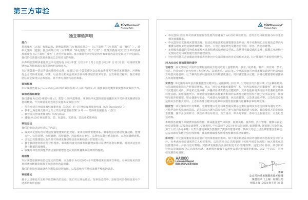 上海2024年7月3日 /新闻稿网 - Xinwengao.com/ — 2024年6月20日,德国莱茵TÜV大中华区(简称"TÜV莱茵")为中化国际(600500.SH)《2023年度可持续发展报告》提供独立性鉴证服务,并出具报告鉴证声明。这是TÜV莱茵连续第四年为中化国际提供该项服务。TÜV莱茵依据AA1000AS v3标准,对该报告中披露的与经济、环境、社会相关的实质性议题,以及可持续发展绩效信息和数据进行了全面评估。