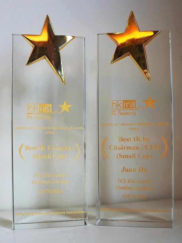 香港2024年7月5日 /新闻稿网 - Xinwengao.com/ — TCL电子控股有限公司("TCL电子"或"公司",01070.HK)于香港投资者关系协会(HKIRA)举办的第十届投资者关系大奖评选中荣获"最佳投资者关系公司"和"最佳投资者关系(主席/行政总裁)"两项大奖,彰显投资界对TCL电子在公司治理、投资者关系及资本市场表现等方面的高度认可。