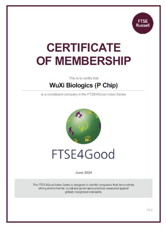 上海2024年7月10日 /新闻稿网 - Xinwengao.com/ — 全球领先的合同研究、开发和生产CRDMO服务公司药明生物(WuXi Biologics, 2269.HK)宣布,公司连续第四年入选"富时社会责任指数系列" (FTSE4Good Index Series),充分彰显了公司在可持续发展领域的卓越表现。 药明生物入选富时社会责任指数系列 富时社会责任指数系列由伦敦证券交易所集团(LSEG)旗下的指数和数据提供商富时罗素(FTSE Russell)于2001年推出,旨在衡量企业在可持续发展实践中的卓越表现。该指数系列对全球47个发达市场和新兴市场中的8000多只证券进行独立和全面的数据分析。过去几年,药明生物富时罗素ESG评分的总分和各议题分均有显著提升。2024年,公司ESG评分排名行业前7%。 药明生物首席执行官,ESG委员会主席陈智胜博士表示:"我们非常荣幸能够再次被纳入富时社会责任指数。这印证了我们始终贯彻可持续发展战略的坚定承诺,更是对公司在环境、社会和治理等方面管理及实践成效的有力认可。展望未来,我们将继续把可持续发展作为企业治理的核心和全球业务发展的战略基石,为全球合作伙伴及社会公众创造更大价值。" 药明生物在联合国可持续发展目标的指导下,沿着可持续发展道路稳步向前。公司的战略和举措得到了全球评级机构的广泛认可。过去一年中,药明生物入选标普道琼斯可持续发展世界指数和新兴市场指数、在明晟MSCI ESG评级中获得AAA评级、获得国际权威企业可持续发展评估机构EcoVadis授予的"铂金"奖牌、获评晨星Sustainalytics "行业最高评级"和"区域(亚太)最高评级"企业、跻身CDP水安全"A级榜单",并获得CDP气候变化领导力级别评分A-。 关于药明生物 药明生物(股票代码:2269.HK)是一家全球领先的合同研究、开发和生产(CRDMO)公司。公司通过开放式、一体化生物制药能力和技术赋能平台,提供全方位的端到端服务,帮助合作伙伴发现、开发及生产生物药,实现从概念到商业化生产的全过程,加速全球生物药研发进程,降低研发成本,造福病患。 药明生物在中国、美国、爱尔兰、德国和新加坡拥有超过12000名员工。通过药明生物的专业服务团队,以及先进技术和精深洞见,公司为客户提供高效经济的生物药解决方案。截至2023年12月底,药明生物帮助客户研发和生产的综合项目高达698个,其中包括24个商业化生产项目。 药明生物将环境、社会和治理(ESG)视为业务发展和企业精神的重要组成部分,并致力于成为全球生物药CRDMO领域的ESG领导者,例如应用更绿色环保的新一代生物制药技术和能源等引领行业发展。公司成立了由首席执行官领导的ESG委员会,全面落实ESG战略并践行可持续性发展承诺。更多信息,请访问:www.wuxibiologics.com
