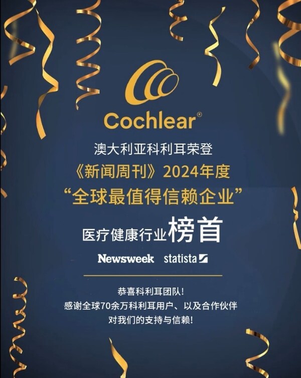 北京2025年3月21日 /新闻稿网 - Xinwengao.com/ — 科利耳宣布,在美国三大时事周刊之一《新闻周刊》(Newsweek)发布的2024年度“全球最值得信赖企业”榜单中,荣膺医疗健康行业榜首。其评选结果被视为跨国企业公信力评估的权威风向标。