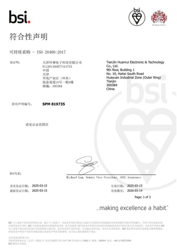 天津2025年3月21日 /新闻稿网 - Xinwengao.com/ — 近日,天津环睿电子科技有限公司顺利通过国际领先标准、测试及认证机构BSI核查,获得ISO 20400可持续采购符合性声明。这是环睿电子科技在可持续发展领域的一大国际标准化里程碑。 ISO 20400可持续采购认证是来自40多个国家和全球组织的代表(包括联合国环境规划署、经济合作与发展组织和国际工会联合会)共同努力的成果,为将可持续性纳入组织采购流程中提供了指导方针。2017年国际标准化组织(ISO)可持续采购标准化工作项目委员会发布《ISO 20400可持续采购指南》,旨在推动企业通过实施可持续采购来管理采购过程中的可持续风险和机遇,降低组织供应链对经济、环境和社会的影响,实现组织层面的整体可持续性发展。如今可持续采购日益成为企业提升可持续管理绩效的新抓手。 TCL中环供应链管理中心负责人云飞表示,"可持续采购不仅是企业社会责任的体现,更是构建未来竞争力的核心战略。在全球能源转型与双碳目标的驱动下, TCL中环始终秉承‘领先科技,和合共生’使命,践行绿色发展,将可持续理念全面融入供应链战略,致力于成为新能源产业绿色转型的引领者。此次导入ISO20400可持续采购指南,标志着我们在国际标准化框架下建立了科学、透明的可持续采购管理体系。我们旨在通过这一里程碑实现三重价值:一,以可量化的标准强化供应链韧性,降低环境与社会风险;二,将风险防控从被动合规转向主动赋能;三,以平台化思维协同上下游伙伴,构建新能源核心产业的可持续生态圈。可持续供应链建设不是单点突破,而是系统性价值重构。未来我们将持续深化与供应链上下游伙伴的协作,以技术创新和管理变革驱动产业链升级,共建绿色低碳供应链。" BSI大中华区销售总监祝嘉韵表示,"我谨代表BSI恭喜环睿电子此次顺利获得ISO20400可持续采购证书。这一认证是对企业在可持续发展领域卓越表现的高度认可,也是衡量企业社会责任与绿色发展实践的权威标尺。贵司将环境、社会和治理(ESG)理念深度融入采购体系,通过技术创新与供应链优化,实现了商业价值与社会效益的协同增长。这不仅为行业树立了绿色转型标杆,也为全球可持续发展目标提供了实践范本。此次获证,不仅是其自身发展的重要里程碑,也让我们深感自豪。因为这一成就,凝聚着双方共同的努力与心血,彰显了合作的强大力量。我们愿以此合作为起点,以责任为纽带,共创更具韧性的可持续供应链生态,携手迈向更绿色、更包容的未来。"