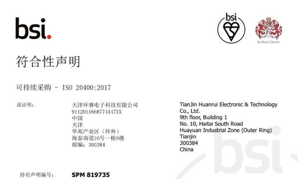 天津2025年3月21日 /新闻稿网 - Xinwengao.com/ — 近日,天津环睿电子科技有限公司顺利通过国际领先标准、测试及认证机构BSI核查,获得ISO 20400可持续采购符合性声明。这是环睿电子科技在可持续发展领域的一大国际标准化里程碑。
