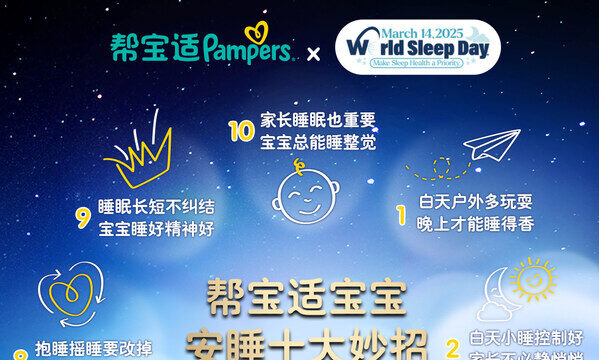 在3月21日世界睡眠日来临之际,帮宝适联合世界睡眠学会发布《帮宝适宝宝安睡十大妙招》,帮助新手爸妈轻松掌握宝宝科学睡觉的正确方法!今年3月,帮宝适还推出了全新[1]升级的"夜用王者[2]"帮宝适安睡拉拉裤,用实力诠释"帮宝小紫裤,整夜罩得住[3]",帮助宝宝整晚安睡,完整贴合了今年世界睡眠日的主题——"健康睡眠,优先之选",守护宝宝的健康睡眠。