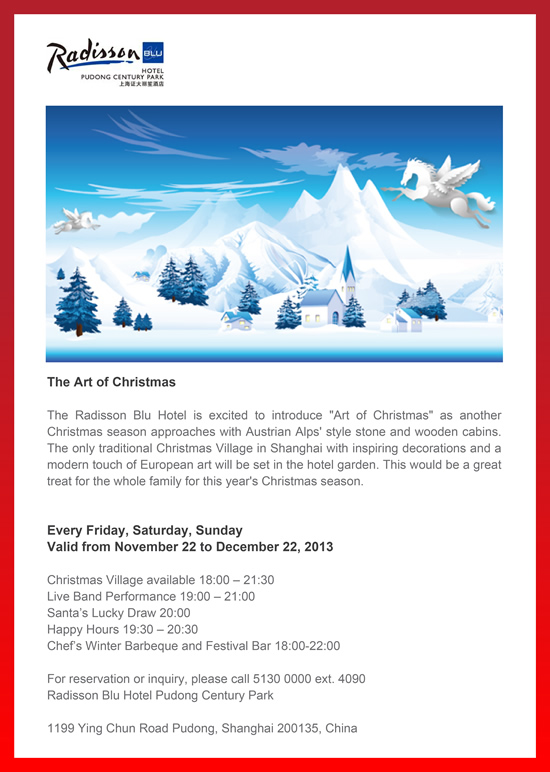 Where are the most influential people spending their money this month in China? Shanghai, China, December 18, 2013 /Xinwengao.com/ - With so many cities, so many destinations, and so many classy places popping up in all of China’s major cities, how can a hip person find a great place to relax this December without leaving the warmth of one of the major cities? VIPmimi.com is working with hotels and travel agencies around China and has come up with a great list of activities. For vacationers looking for a “staycation” in Beijing, China’s capital city, a foray to Beijing’s outlying Huairou County makes a great trip in the winter. The Spring Legend Holiday Hotel is nestled in the Beijing mountains and has abundant skiing resources for those who are adventurous, and fireplaces and great food for those who want to stay inside. The Spring Legend Holiday Hotel has a unique winter package for RMB580 that includes one night accommodation, breakfast the next day, and skiing nearby. Plus, the European-themed location will please those overseas travelers who year for home, and those local Beijingers who want to have a taste of what Europe has to offer. Going south to Shanghai, residents of this cosmopolitan city also have a great opportunity not to leave home. The Radisson Blu Hotel Pudong Century Park is hosting a Christmas Village that comes complete with a Santa Claus, lucky draw, barbeque, and live band performance. The Christmas Village highlights also local art and is next to a great art gallery. About VIPmimi.com In Mandarin Chinese, “mimi” means “secret”, so VIPmimi.com provides you the best secret VIP deals, travel specials, and exciting dining opportunities in China and around Asia. We work with hotels, airlines, and travel agencies to scour and find the best deals for our high-powered userbase. We then syndicate the deals to users via email, RSS, and social media channels. More information at http://www.vipmimi.com. Website Information: http://www.vipmimi.com